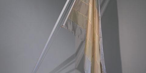 "I created Surrender for a solo show I titled Unicorn in 2017- a standard American Flag created from the lightest hues of nylon I could source for the current flag palette of The United States of America. The flag company I was working with on the other pieces for the show would not fabricate it out of fear of losing veteran customers so I had to parse it out - the commercially embroidered stars were done by a Ukrainian owned ball cap business near my studio . . . The pole is white and the entire object is luminous. It seems bleached out and plays on ideas of Albocracy and chroma-phobia, faded glory."