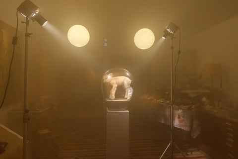 "#lamby, (2014), is a stunning taxidermied lamb resting atop a gently cut slab of cottonwood limestone and kept sacred under a handblown glass dome. Is it preserving an innocence or virginity? Or is it something so transcendent as to be completely unobtainable? Carefully crafted objects like this questions one own fleeting existence."