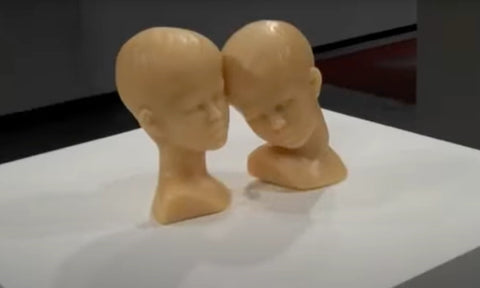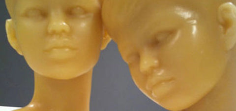 The Beautiful Boys sculptures were made with beeswax, re-casting found mantlepiece objects. The literal transformation that takes place in this process, as well as the changeable nature of beeswax, speaks to the loss of identity and lack of ownership that is a hazard of art-making, especially when control has been taken away from the artist. The beeswax sculptures are accompanied by Honig’s “Grandma frames,” made by installing a wick in the interior base of the frame and creating an ash image until it melts. These works represent a constant cycle of loss through the ephemeral properties of fire and melting.