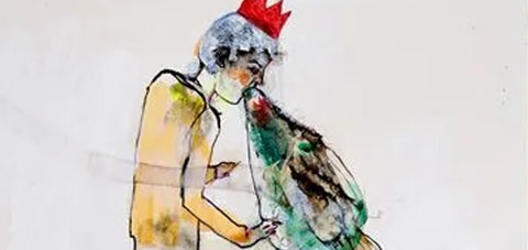 The three series of works featured in the show deal with varying forms and phases of loss. While still on Work of Art, Honig began her Puker drawings. The mixed media pieces depict vomiting individuals, their colorful ejections symbolizing the release of excesses acquired in a culture of consumption. Honig admits that she sometimes felt ill when making these works, and we can see in the spirited and sometimes chaotic pieces the emotional and physical force of the artist.